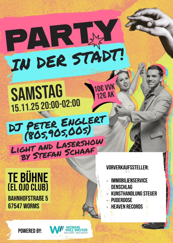 Am 15. November 2025 steigt in der TE Bühne (Bahnhofstr. 10, Worms) wieder unsere „Party in der Stadt“! 🕺💃